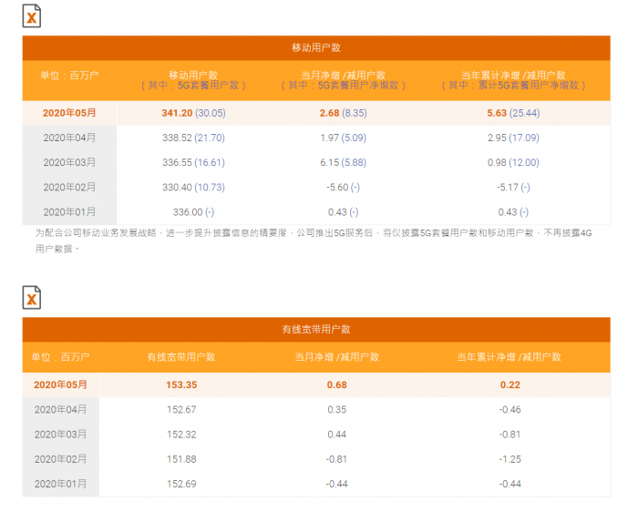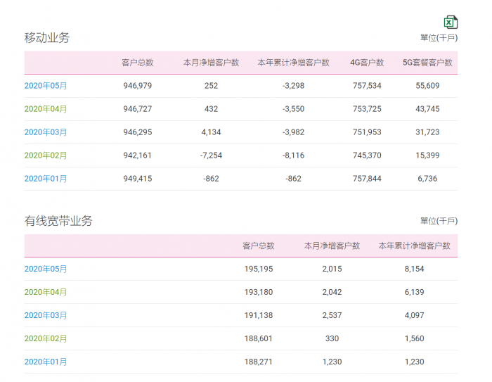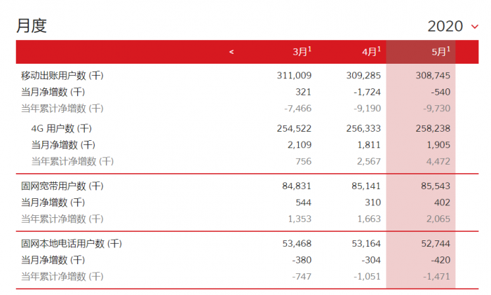 在移动用户数方面,截至2020年5月,中国移动移动用户数达到9.46979亿户,当月净增25.2万户,4G用户数达到7.57534亿户;中国电信移动用户数累计达3.412亿户,净增268万户;中国联通移动用户累计达3.09亿户,当月净减54.0万户,其中4G用户达2.58亿户。数据显示:中国移动的移动用户依旧遥遥领先,比电信联通总和还要多。但从用户增长数来看:中国电信净增268万户、中国移动净增25.2万户、中国联通净减54.0万户,中国电信5月移动用户迎来爆发增长,比中国移动净增10倍还要多。再来看4G用户,中国移动已经达到7.57534亿户、中国联通也达到2.58亿户。而日前,工信部公布1-5月通信业经济运行情况,截至5月末,三大运营商的4G用户数为12.79亿户,在移动电话用户总数中占比为80.3%,较4月末比重提高0.3%。固网宽带业务方面,格局依旧。其实中国移动自拿到固网牌照、发力固网宽带市场后,就一直在用户总数以及净增速度上都保持绝对第一的位置;中国电信第二,中国联通始终未破亿。数据显示:5月,中国移动固网宽带用户达到1.95195亿户、当月净增201.5万户;中国电信固网宽带用户数1.5335亿户、当月净增68万户;中国联通累计达8554.3万户、当月净增40.2万户。